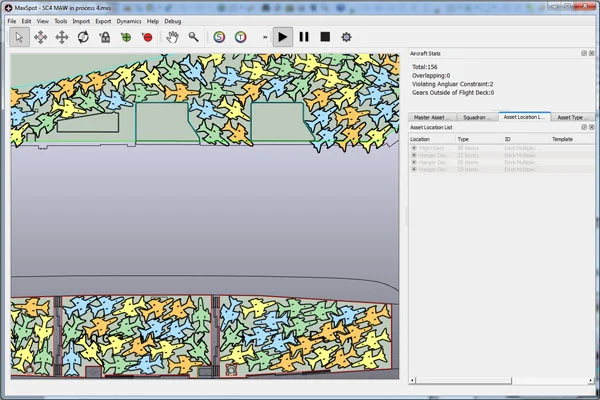 To address this need TA developed an asset tracking physics-based carrier layout tool. Physical interaction between the ship and equipment are created using a physics engine that prevents overlapping components and invalid placements. Assets are tracked through various positions as the mission plan is recorded. As part of the phase II SBIR TA will provide NAVAIR Lakehurst, a fully functional stand-alone spot factor software tool which is current under evaluation by the Carrier Analysis Laboratory.