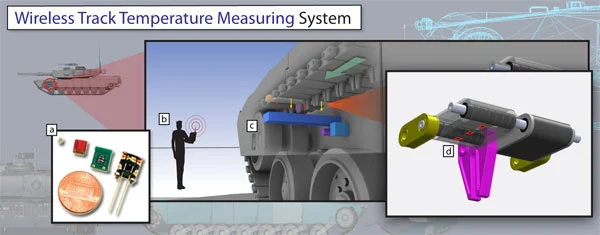 TA's Wireless Tank Track Monitoring (WTTM) system uses embedded, battery-free RFID sensor chips. WTTM uniquely combines industry-proven miniature RFID sensor chip technology from partner Phase IV Engineering with wireless, mesh-network telemetry capabilities and ultra-rugged monolithic packaging. Phase IV RFID sensors overcome limitations of access and surface contamination through an advanced ASIC RFID design that enables elastomer-penetrating, multi-point temperature sensing from a battery-free component about the size of a single grain of rice. Because the read range of passive RFID sensors is limited, WTTM applies Phase IV sensor chips in a TA measurement suite that wirelessly transmits real-time data to one or more visualization/storage terminals via a ZigBee mesh network. This allows test personnel on or off a full-speed moving vehicle to monitor track component temperatures, up to 1000 feet away. WTTM has the advantage of having no moving parts or critical mechanical tolerances, allowing the hardware to be fully potted and monolithic.